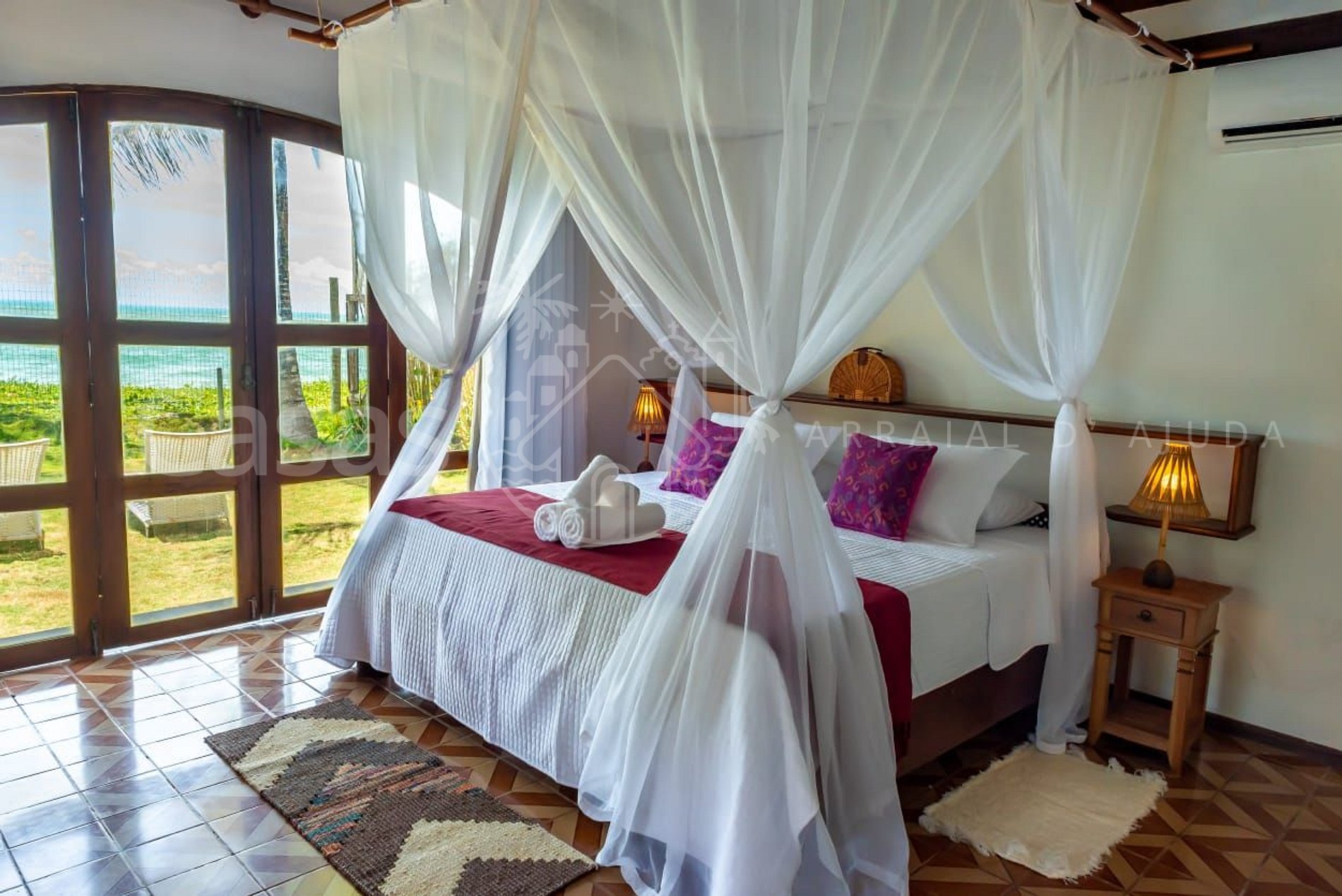 Suíte 6 – Vista mar parcial – Cama king com dossel, bicama solteiro, ar-condicionado, tv, cortina blecaute, espelho de corpo, varanda com rede e cadeiras