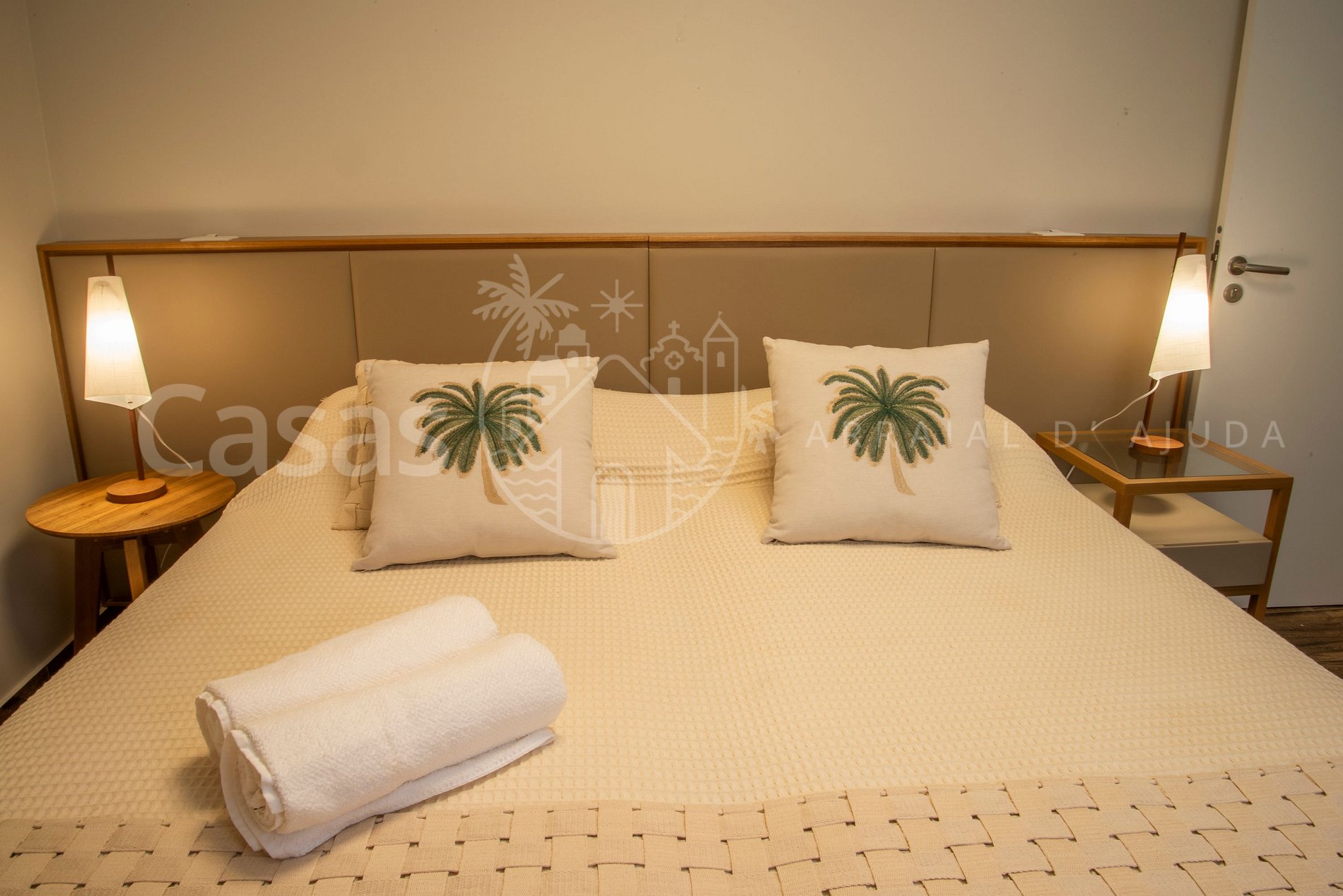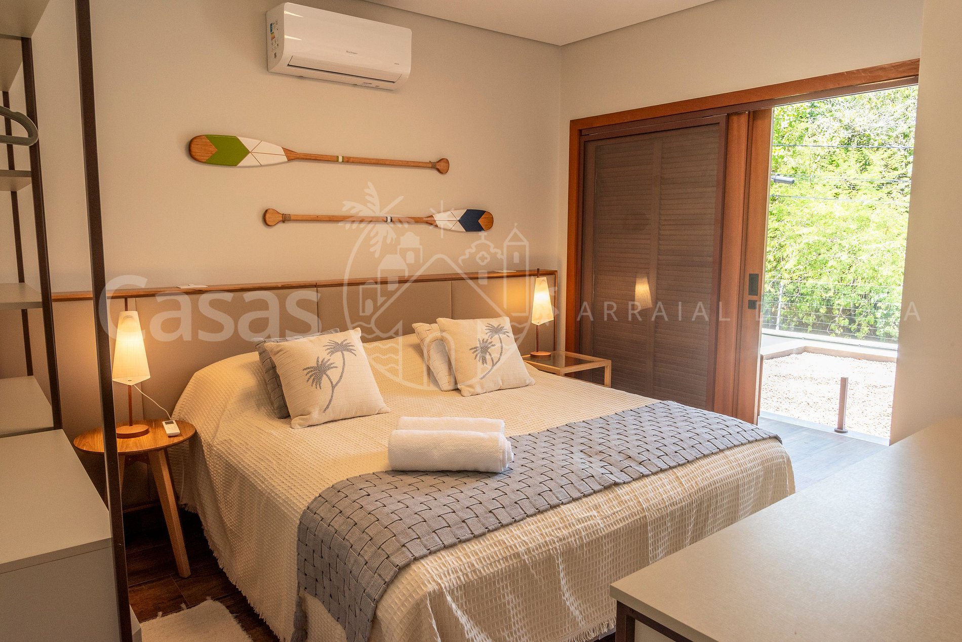 Suíte 2- Piso Superior: cama King (ou 2 solteiro), ar-condicionado, armário, poltrona, mesas laterais, varanda