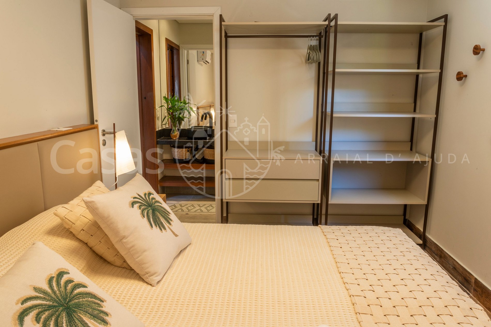 Suíte 1 – Piso Superior: cama King (ou 2 camas solteiro), mesas laterais, móvel com gavetas e prateleiras, ar-condicionado, varanda com poltrona e mesinha lateral