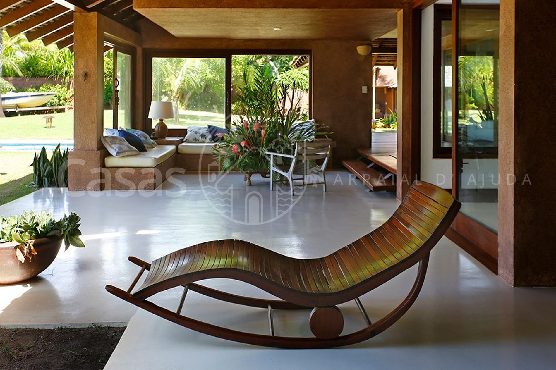 A casa principal, moderna e lindamente construída em frente o mar encanta por sua amplitude e diversidade de ambientes, conectando a propriedade ao jardim e oferecendo uma sensação de bem estar e conexão com a natureza.